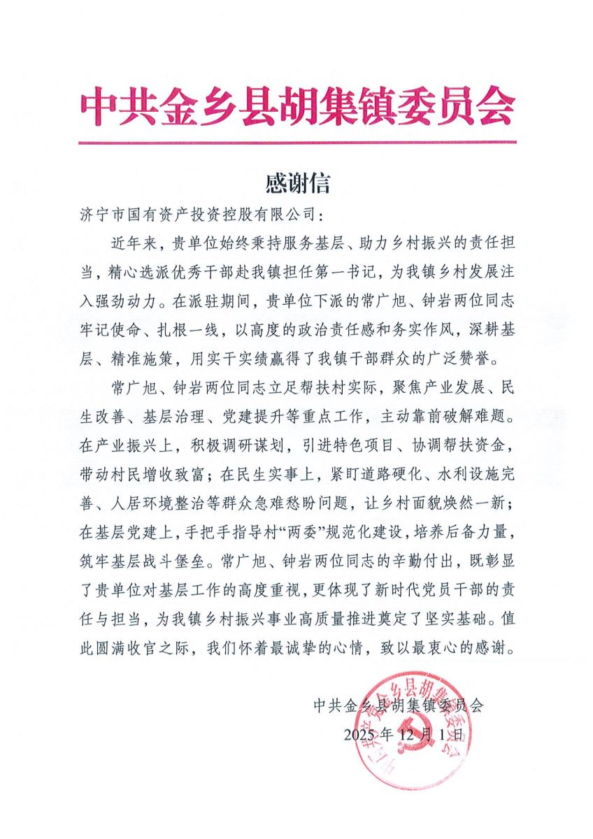 胡集镇党委在感谢信中表示,华体会手机网页版-华体会(中国)始终秉持服务基层、助力乡村振兴的责任担当,精心选派优秀干部赴镇担任第一书记,为当地乡村发展注入强劲动力。常广旭、钟岩两位同志牢记使命、扎根一线,以高度的政治责任感和务实作风,聚焦产业发展、民生改善、基层治理、党建提升等重点任务,主动作为、精准施策,赢得了镇村干部群众的广泛赞誉。